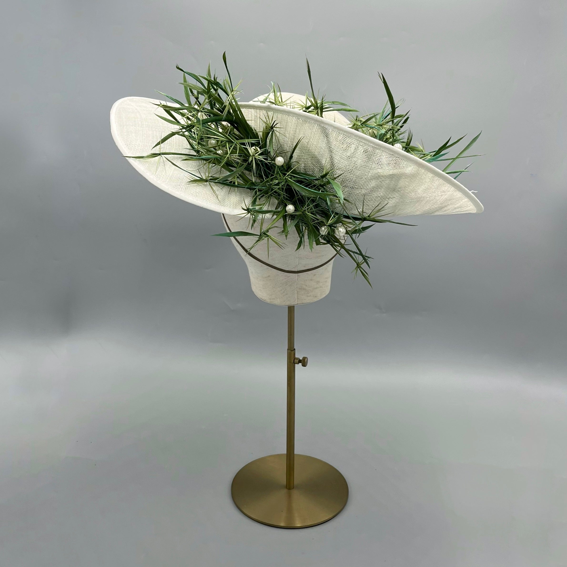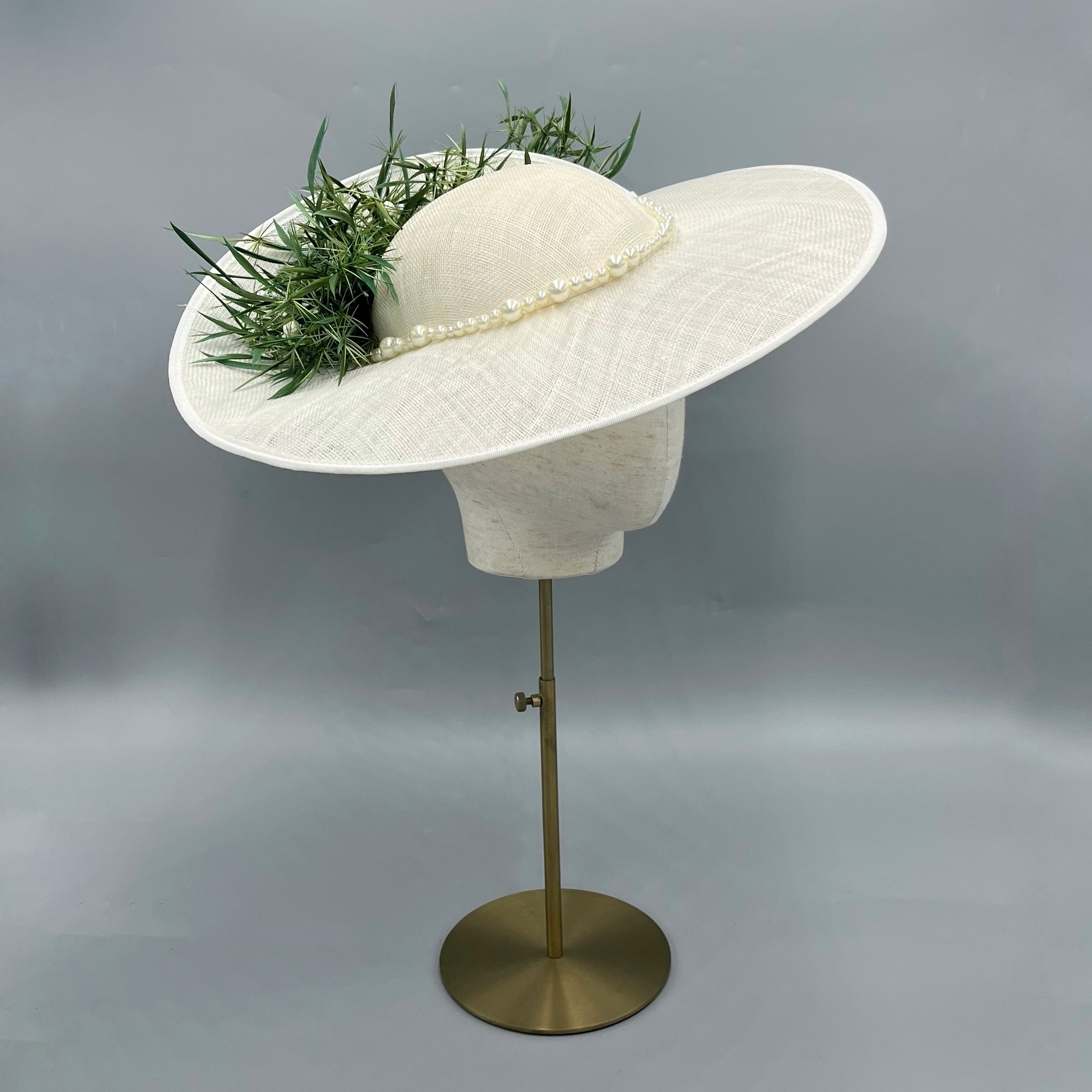 Ivory Split Brim Hat with Dark Green Feathers & Faux Pearls