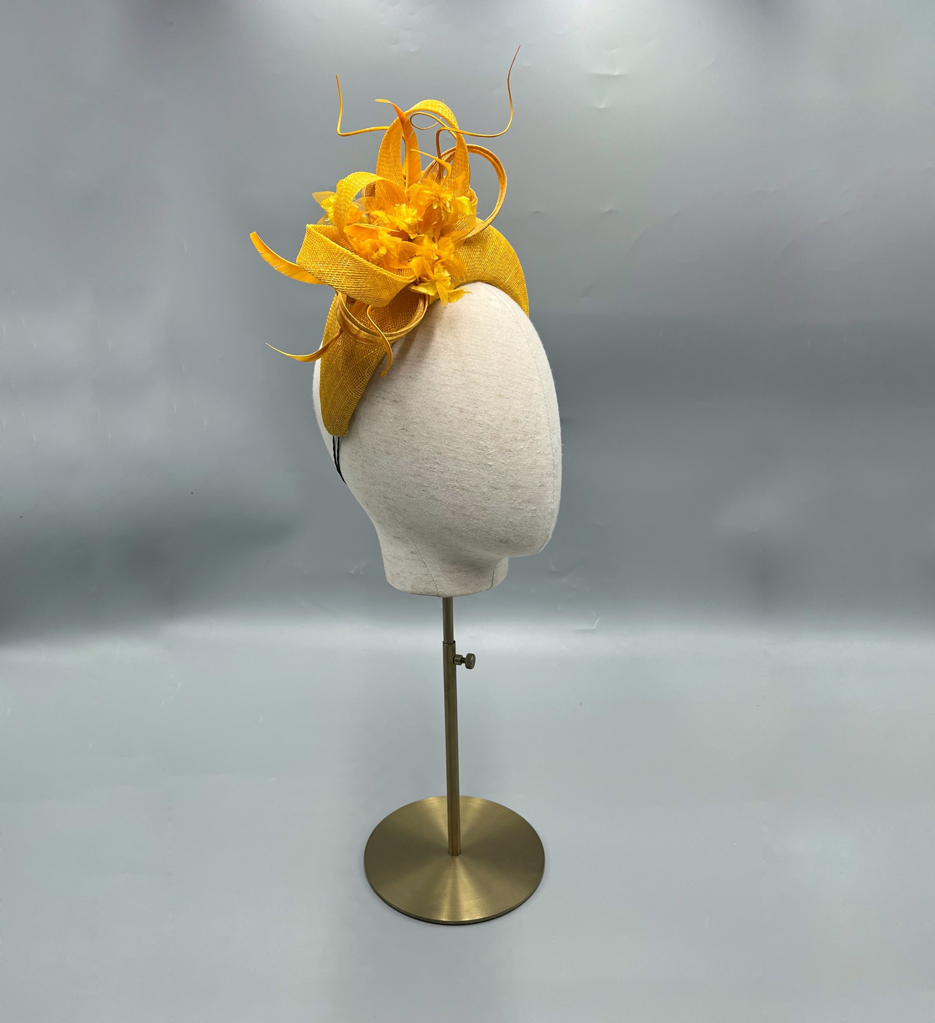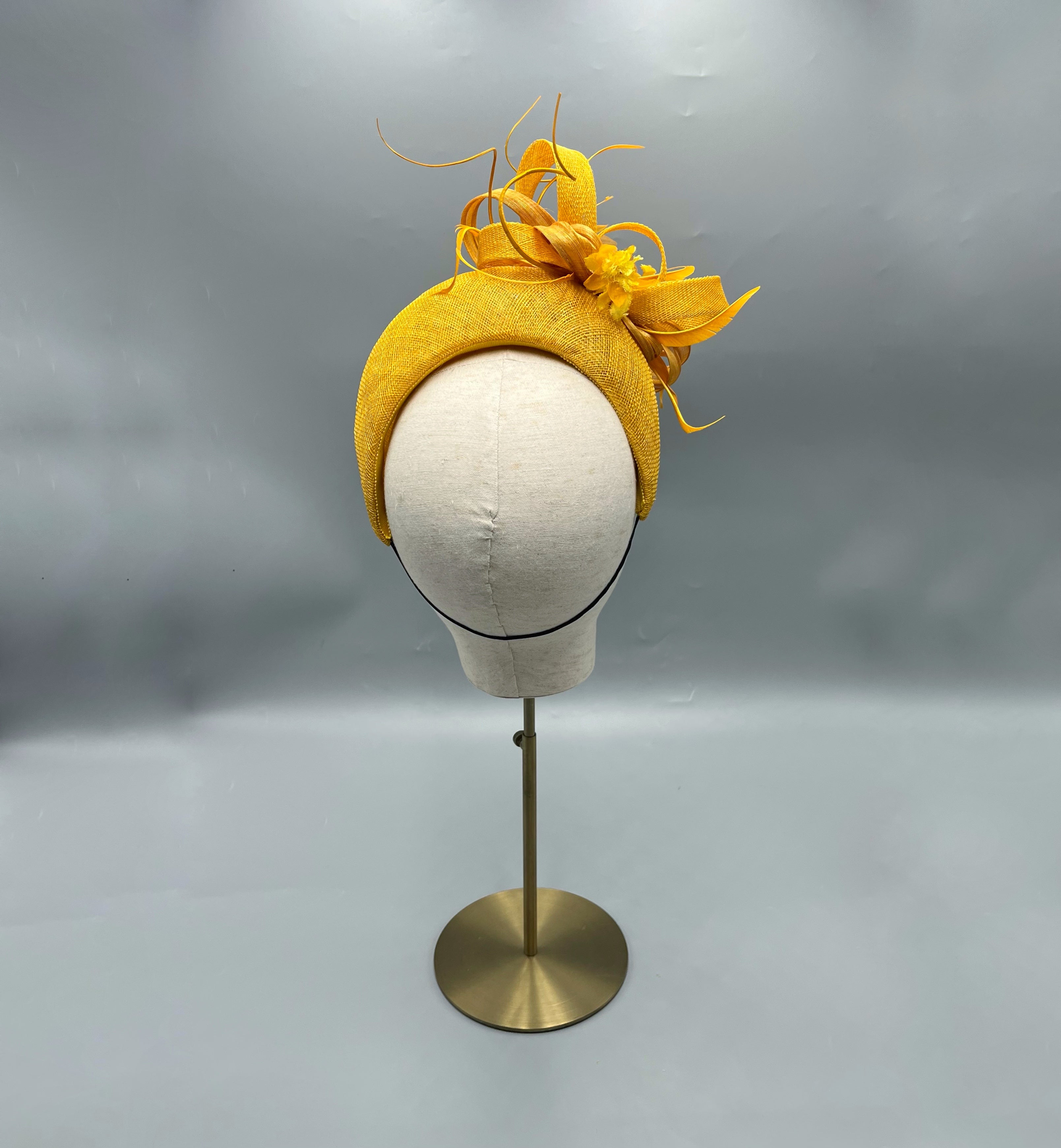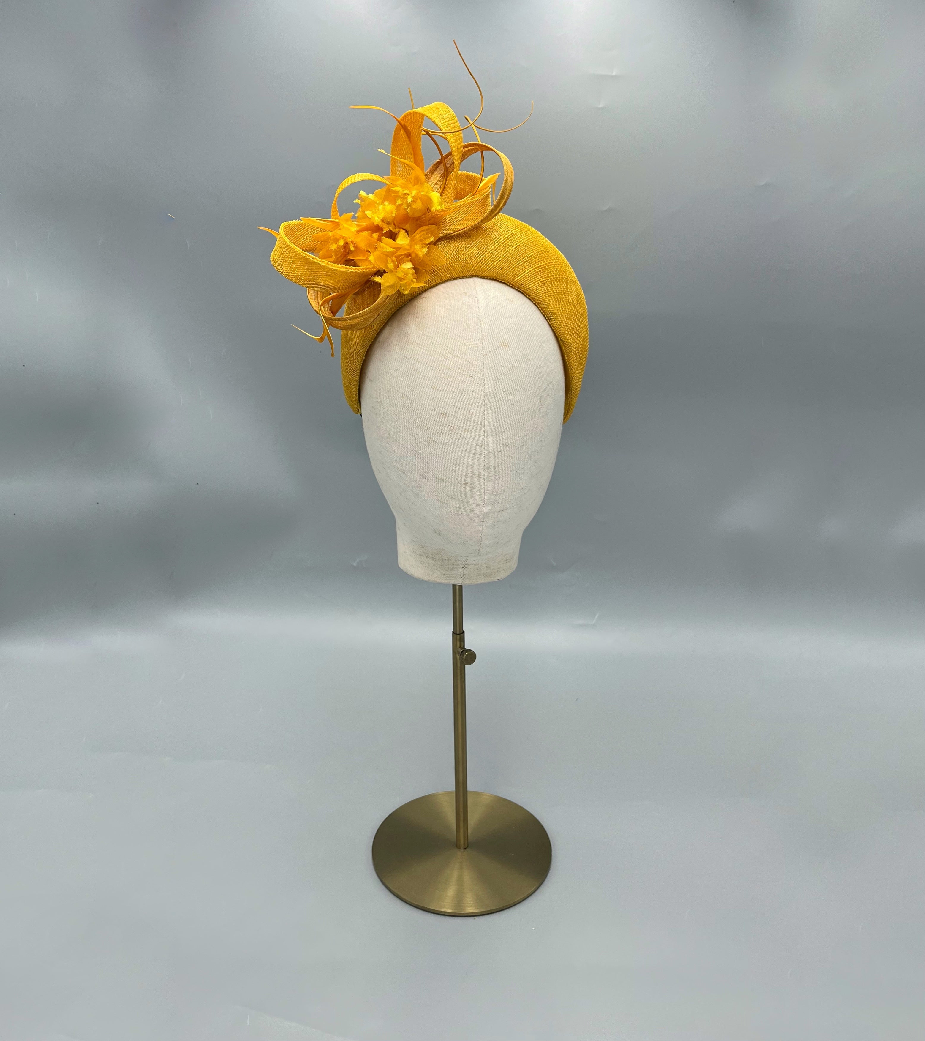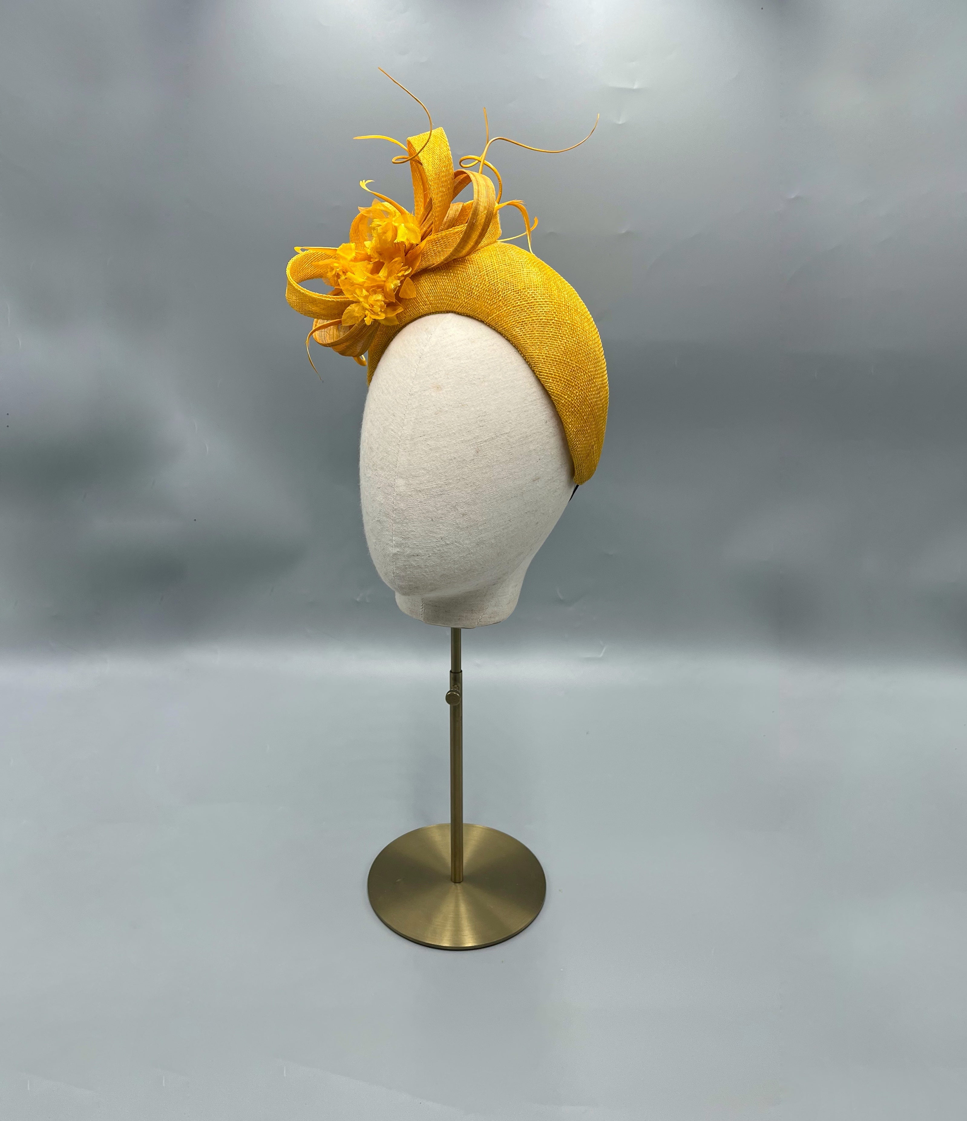 A beautiful halo headpiece created from mustard yellow sinamay. The fascinator has been adorned with matching fabric flowers and sinamay and silk abaca bows.
