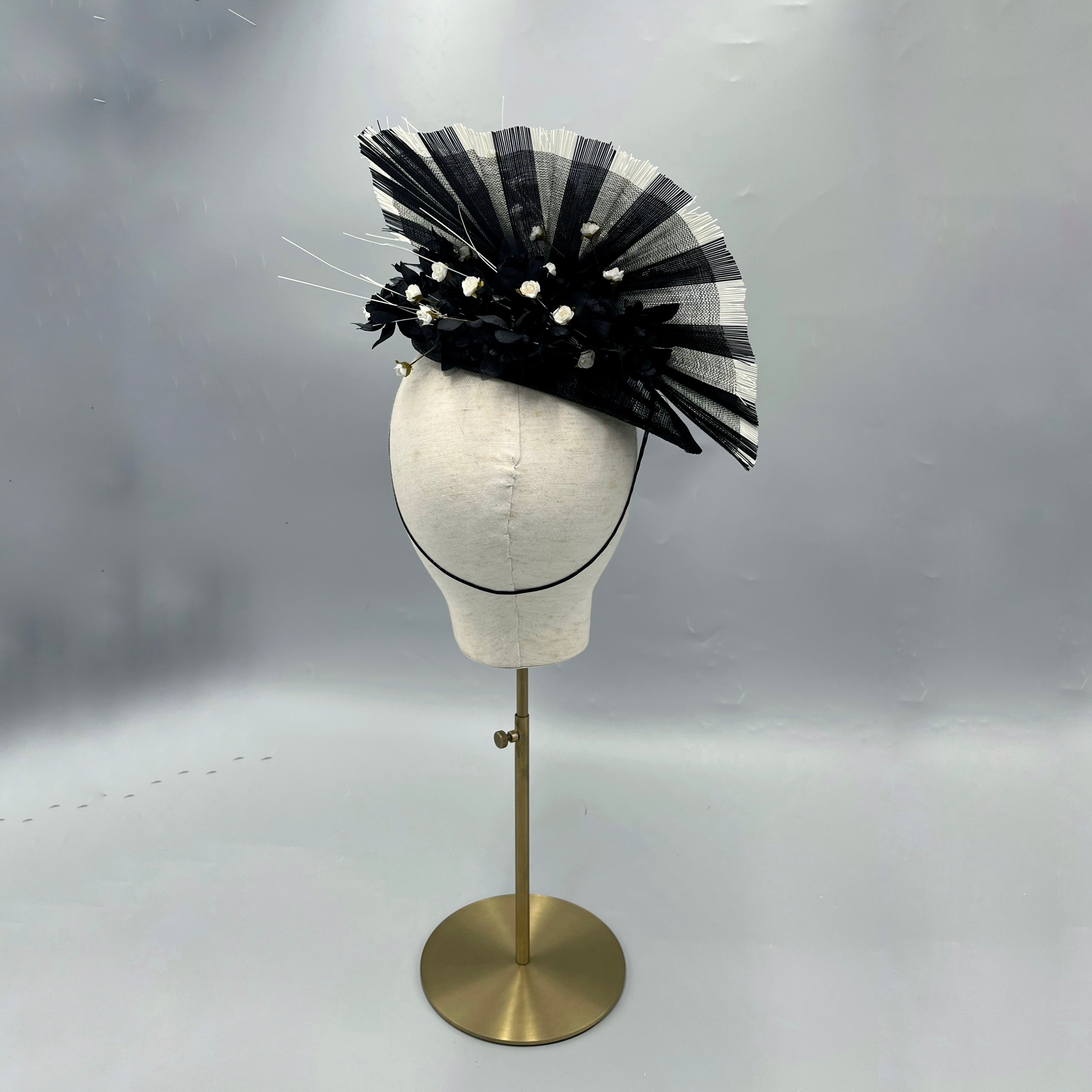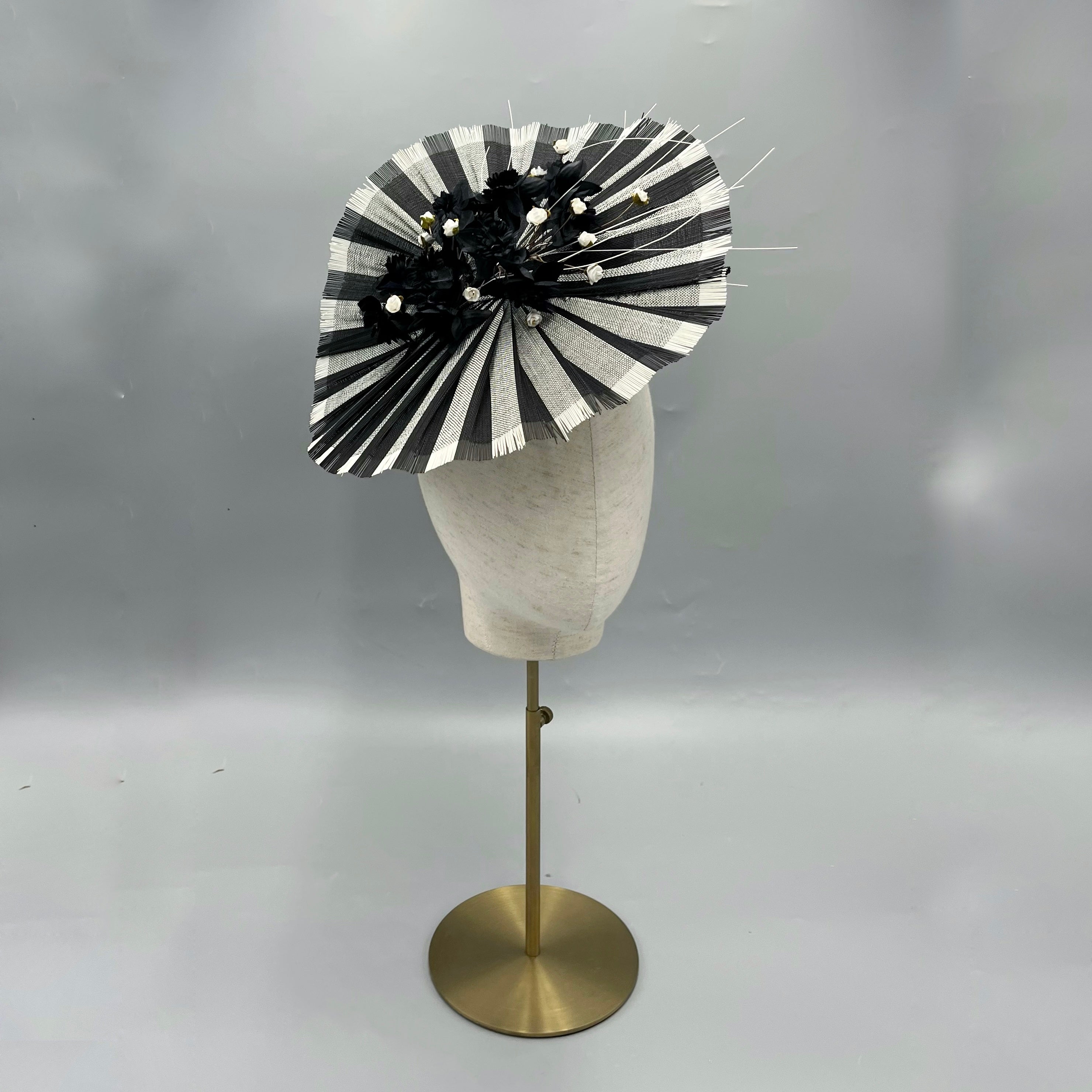 A striking monochrome fascinator, sculpted around a dramatic hand-pleated straw disc in timeless black and ivory. At the centre, a carefully composed cluster of matte black and white florals introduces depth and texture, forming a bold yet beautifully balanced focal point. Subtle floral detailing is echoed at the back of the headpiece, creating a sense of movement and considered design from every angle.