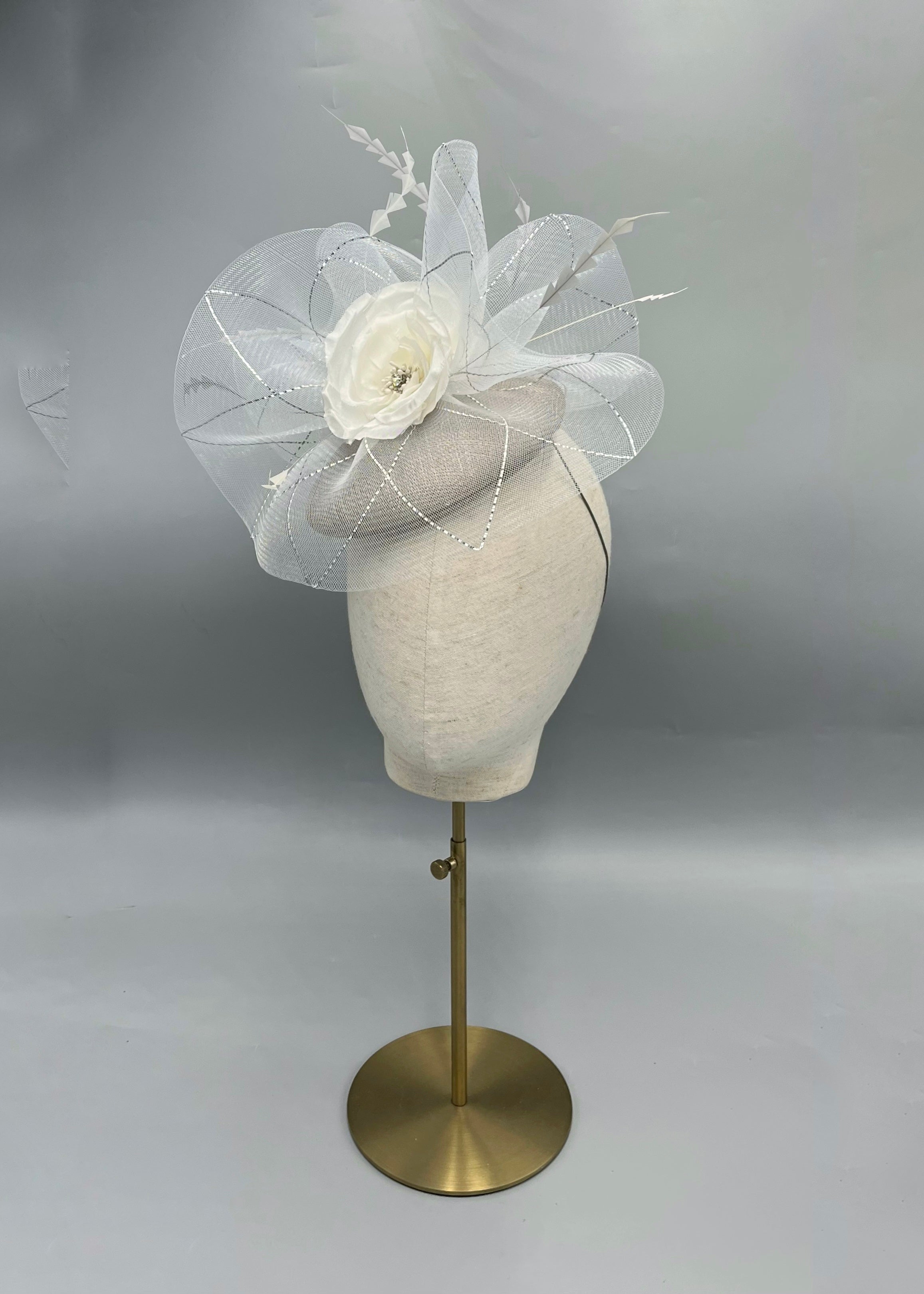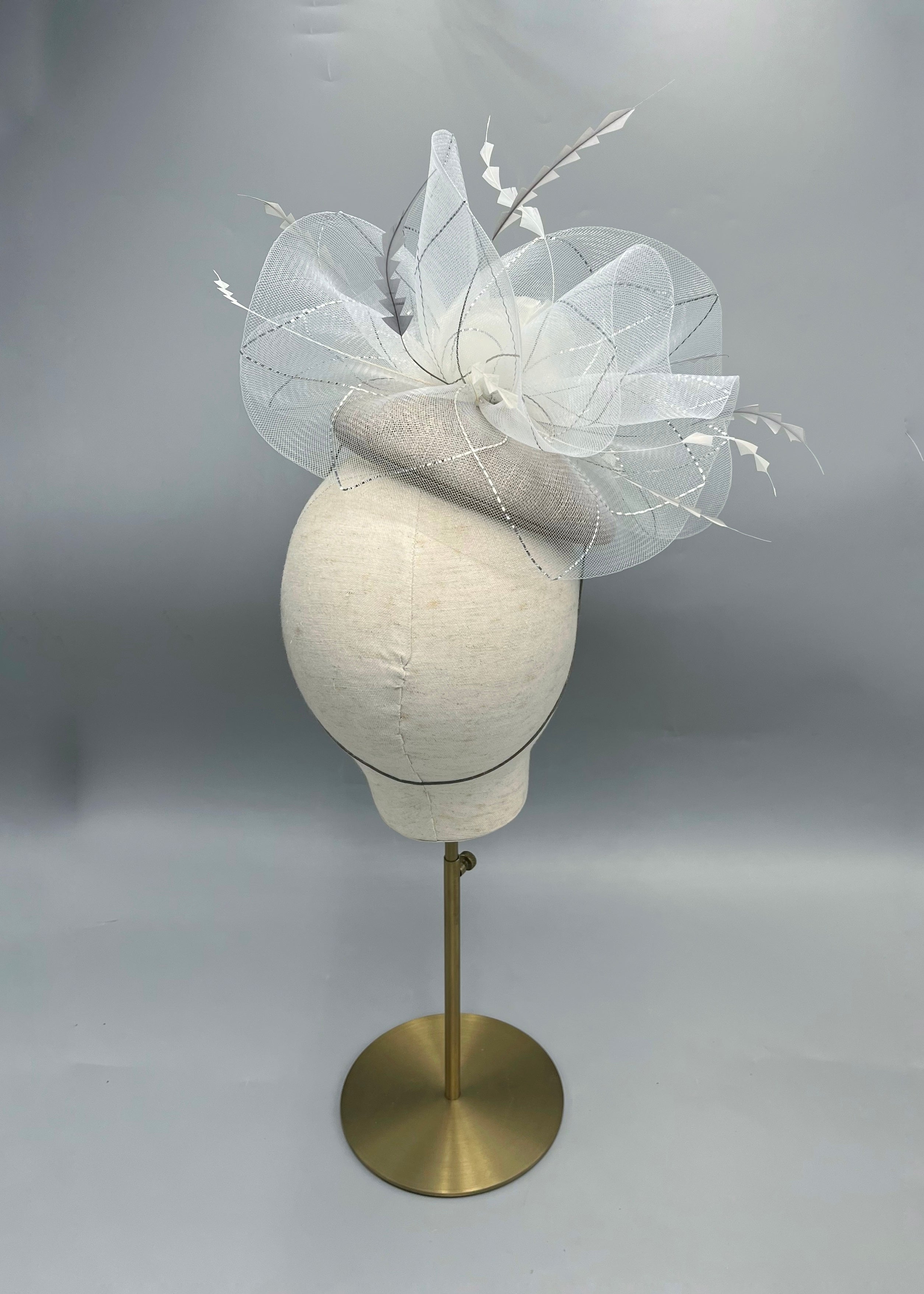 A statement in sophistication, the Silver Whisper fascinator embodies refined glamour. Featuring a soft grey sinamay base and sculpted white crinoline waves, it exudes graceful movement and modern artistry.